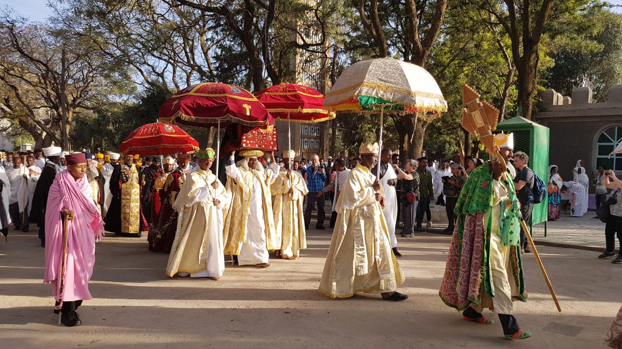 Les prêtres prient à haute voix ou en silence selon les moments, tandis que l’encens et les chants enveloppent tout l’édifice. La conception du sacré est ici très marquée : alors que les catholiques romains ont rendu la messe plus accessible au peuple, notamment après Vatican II, la liturgie éthiopienne reste une théophanie voilée, un acte redoutable de présence divine.